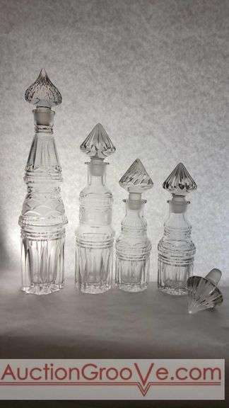4 Crystal Decanters / Cruets with Crystal stoppers. 1 extra stopper. GN