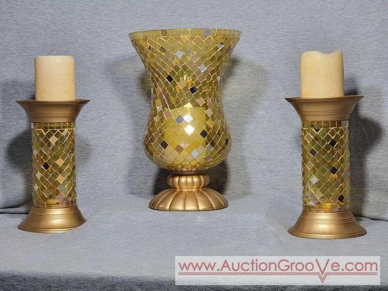 LOT 81 - Partylite Gold Mosaic Candle Holders. 5 x 9 and 8 x 12. LR