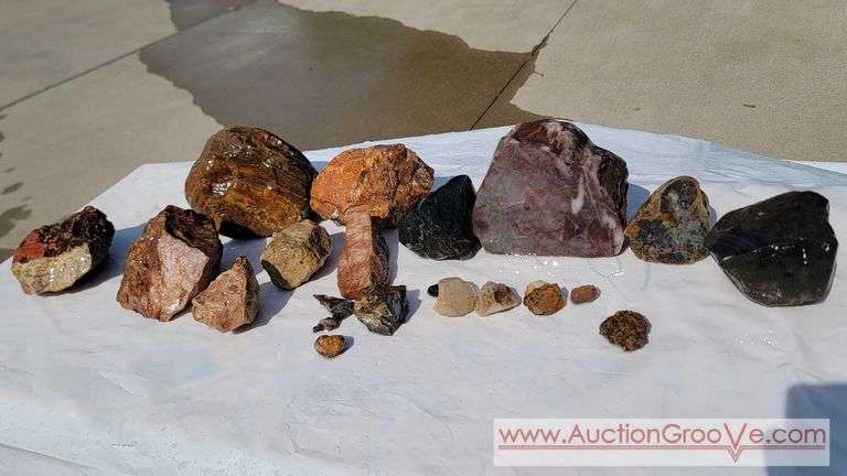 Large Specimens found in bucket with note, "Keep 12/8/20". Several ahave cut faces. One may be Obsidian. Photos shot with water on rocks. GEM & MINERAL RELATED throughout. ROCKS. 44 lbs. GC3