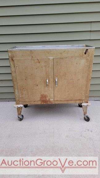 Rolling Metal Cabinet with 2 locking wheels. Heavy duty base possibly for a tool box or from hospital/ industrial use? Opening on top is 33 x 13 5/8". See photos. G