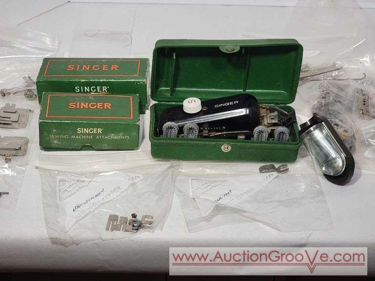 Singer Sewing Machine Attachments. See photos for entire contents. These may be for lot #19 Sewing Machine. Bb