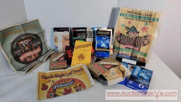 13 - OKTOBERFEST VHS TAPES. Tapes are likely of the UWL MARCHING CHIEFS at parade. At least 9 have sections of Newspapers from their respective years. Earliest date observed is 1997 but we didn't closely examine them. D