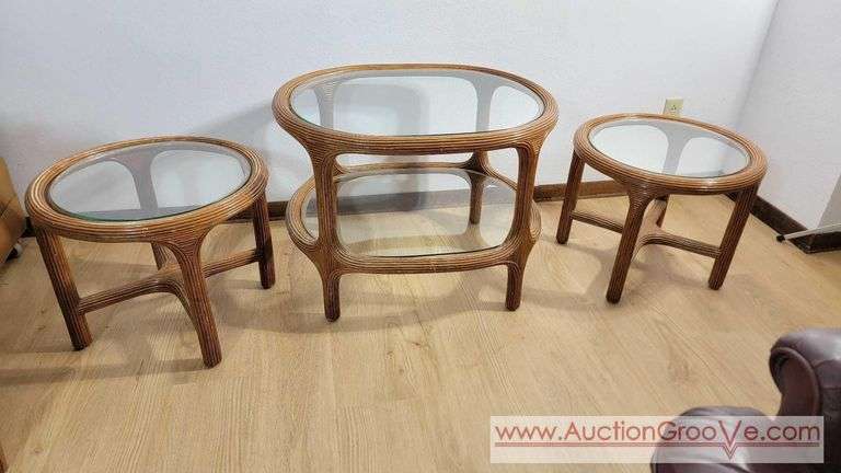 Bamboo or Reed Side Tables and coffee table set. Oval table is 29" w x 24" d x 21" h and Side Tables are 20" diameter x 21" h. D