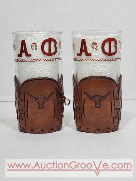 Libbey Bamco. Western Highball Glasses with Longhorn Leather Cup Holder. LR