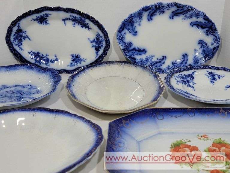 7 Flow Blue Serving Plates and Platters. Featuring Touraine, La Francaise, Verus, Limoges. LR