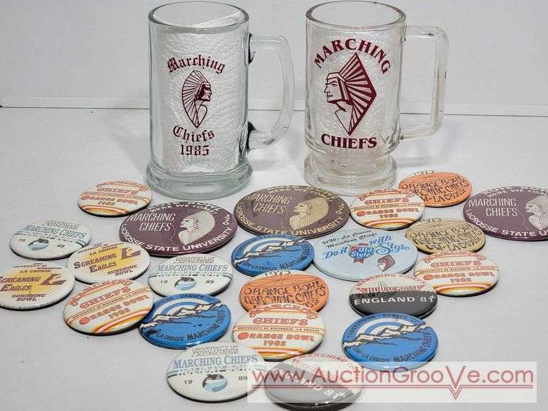 LOT 104 - La Crosse Marching Chiefs Glass Mugs and Buttons. 1970s-1990s. LR