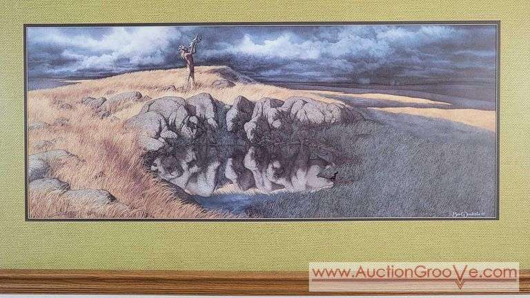 "Calling the Buffalo" by American artist Bev Doolittle. Signed & numbered Limited Edition Print 6379/8500. Double Matted & No Glare glass. Frame measures 42.5" w x 24" h. Matting, backing, and Print slips when moved but drops in place. Fasteners holding backing to frame need to be replaced. Reserve only $170. D