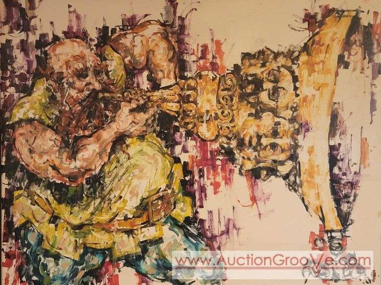 Mid Century Original Painting signed Tomsic. Big Man (Gabriel?) Playing Horn. Original Painting signed "W. Tomsic - GAB. BABY - 1965". Found in the garage and selling as found, this painting could use a good cleaning & tlc. See lot #30 for another Painting by Tomsic. 45.5" w x 35" h. D