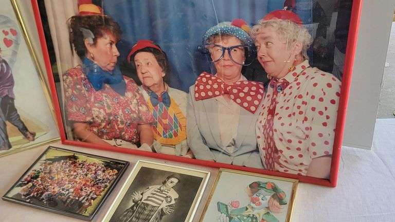 Clowning Around. “What smells funny?” 3 photographs and 2 prints. 1 photos is a clown named Mike Potete and it's autographed. Largest photo is Lefty with a few of her clown Buddies. GS