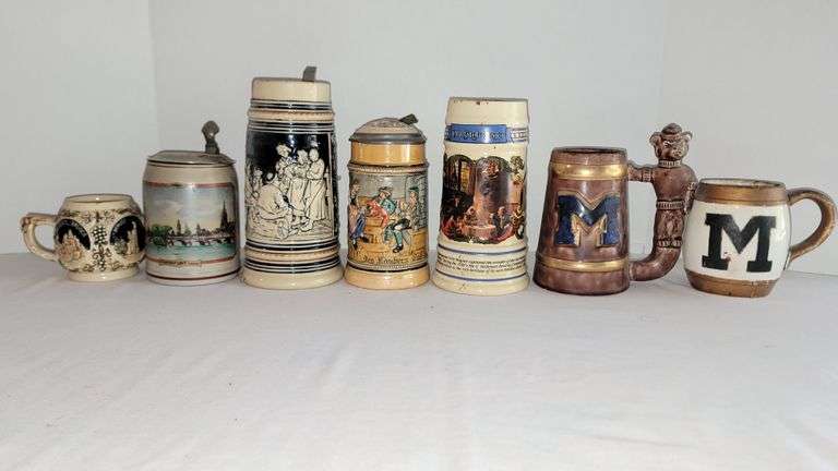 7 beer Steins or Mugs including; Michigan State, Old Style Lagger, and a few from Germany. Sea photos for details. They all need a very thorough cleaning. GS