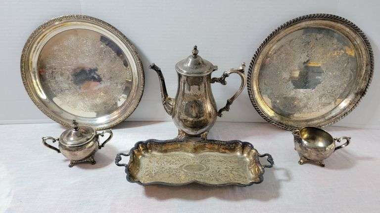 Silverplate Serveware. 2 Round Platters, a Cream & Sugar, a Rectangular Tray and a Coffee pot. See photos for details. GT