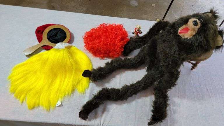 A few Clown items. 2 Wigs, a Figurine, Bear Puppet and a ping pong paddle with a doughnut hole and a bag with a zipper. I don't know what it is. GT