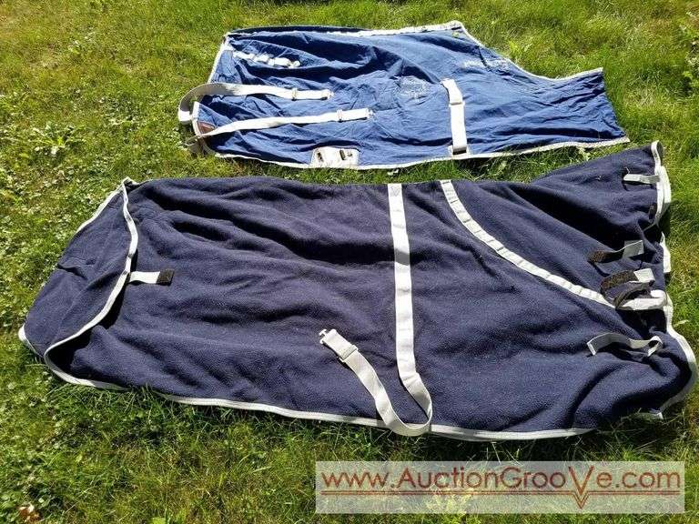 Two blue stable sheets in used condition. Blue "denim" approximately 66in and darker blue Ami-Cell 72in.